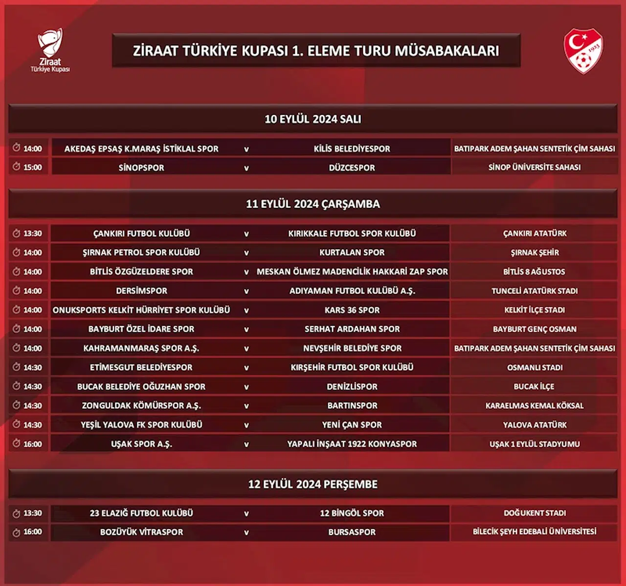 Türkiye Futbol Federasyonu'ndan (TFF) yapılan açıklamaya göre 1'inci Tur maç programı şu şekilde: