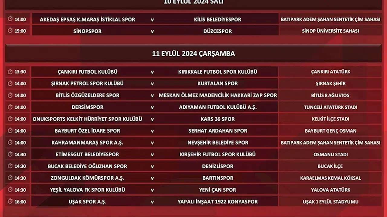 14.00 Kahramanmaraş İstiklalspor-Kilis Belediyespor (Batıpark Adem Şahan Sentetik Çim Sahası)