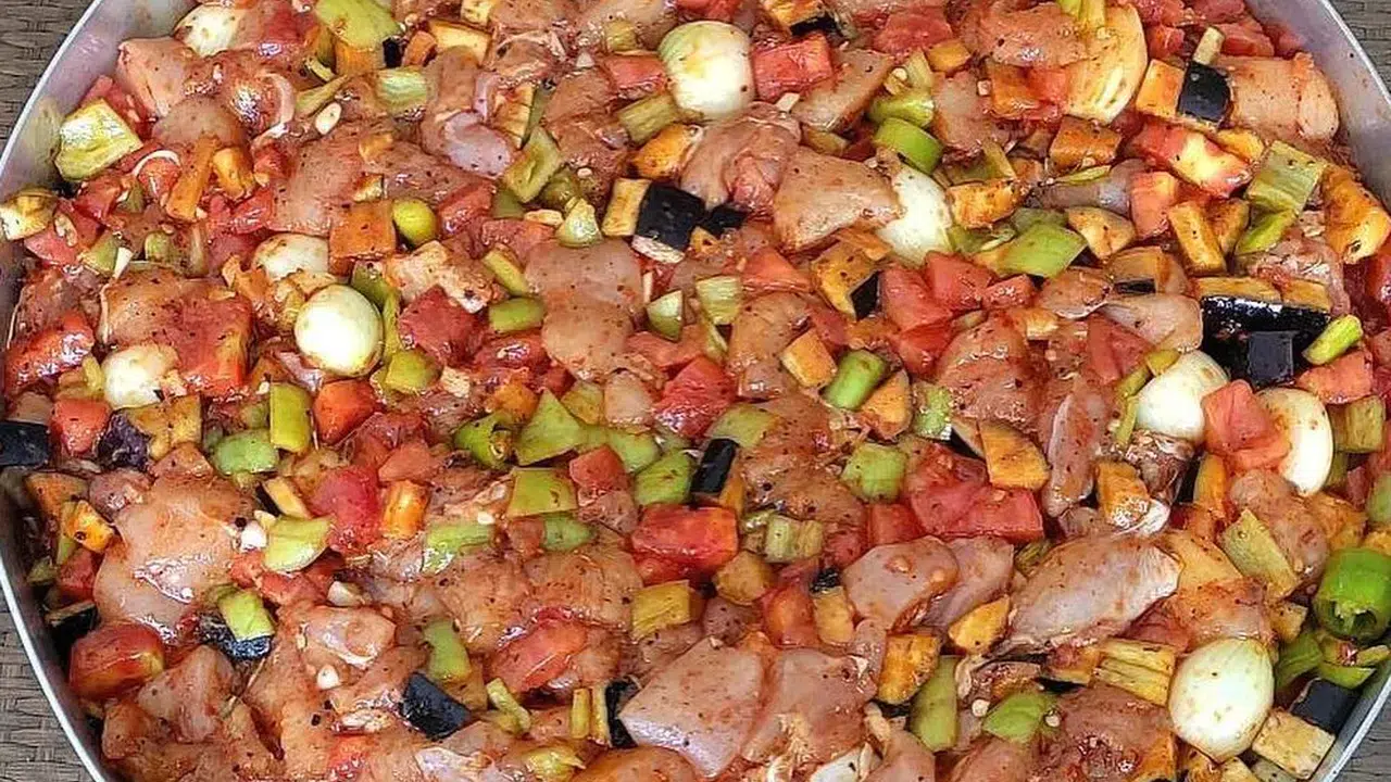 Sebzeleri yıkayın ve iri şekilde eşit olarak doğrayın. Aynı şekilde tavuğu da doğrayın ve sebzelerle birlikte bir tepsiye alın.