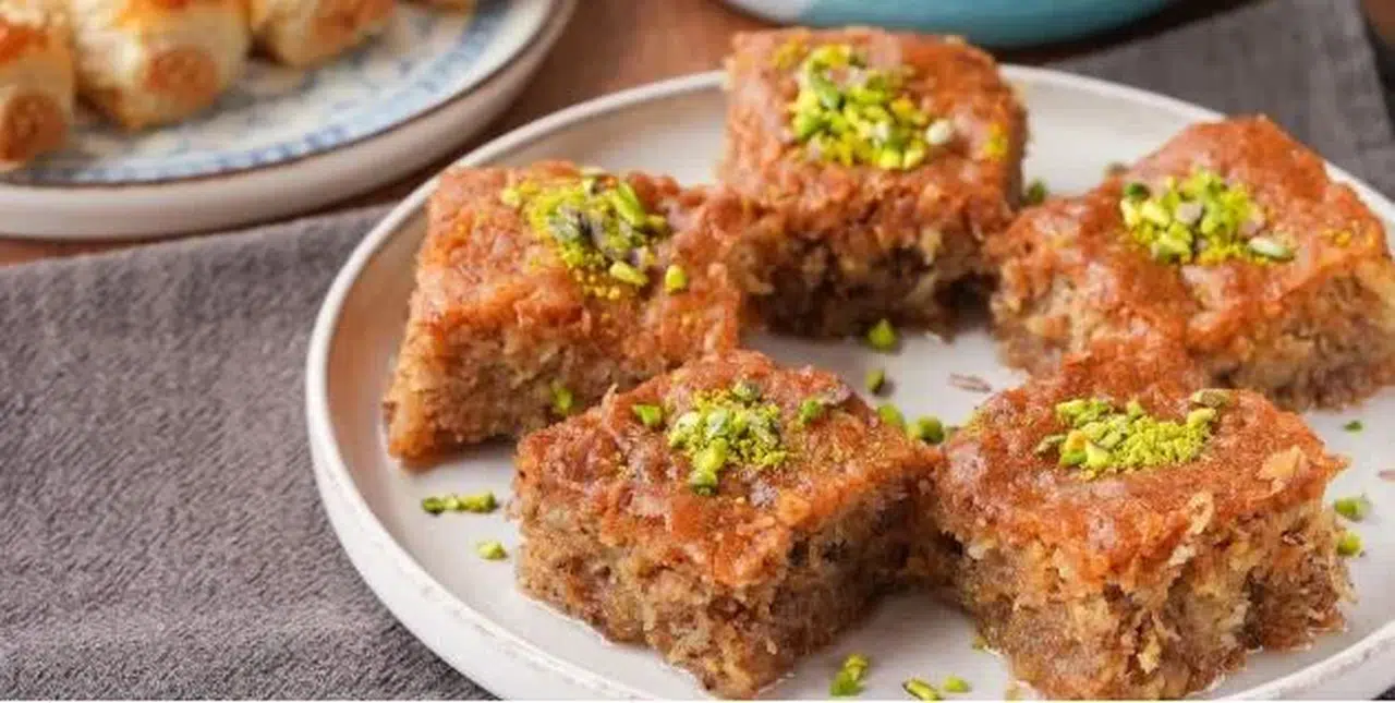 - Sürenin sonunda pişen kadayıflı keki dilimleyerek üzerine şerbetin yarısını gezdirelim.