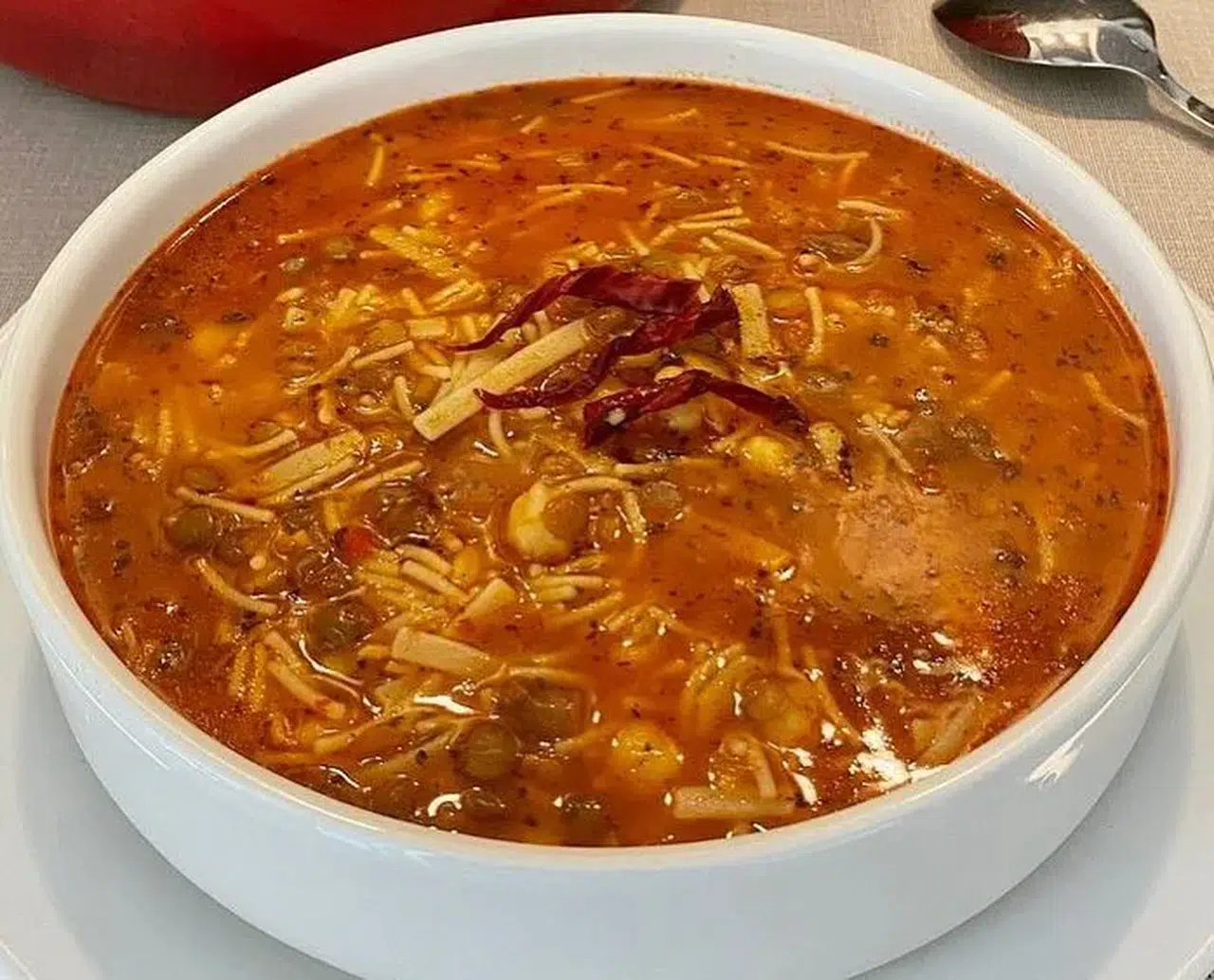 Bu özel çorba, 1 su bardağı haşlanmış nohut, 1 çay bardağı haşlanmış yeşil mercimek, yarım çay bardağı tel şehriye, 1 çay bardağı erişte, 1 yemek kaşığı salça, 1 adet kuru soğan, 1 yemek kaşığı tereyağı, 2 diş sarımsak, 3-4 yemek kaşığı sıvı yağ, 7-8 su bardağı su (isteğe bağlı olarak et suyu da kullanılabilir), tuz, kırmızıbiber, pulbiber ve nane kullanılarak hazırlanıyor.
