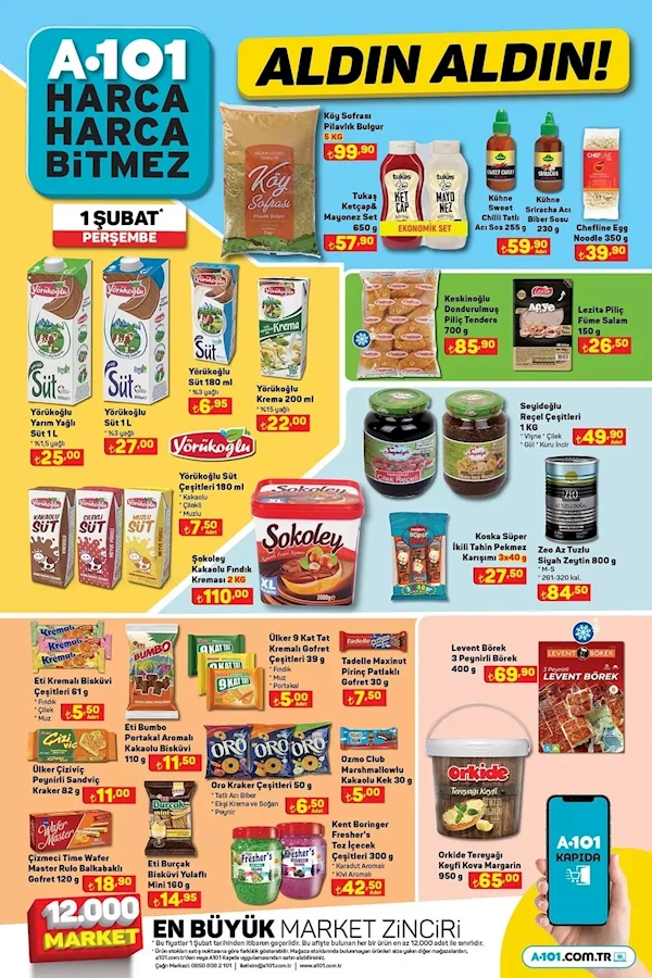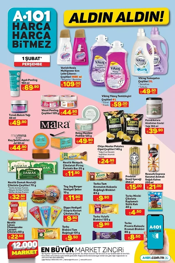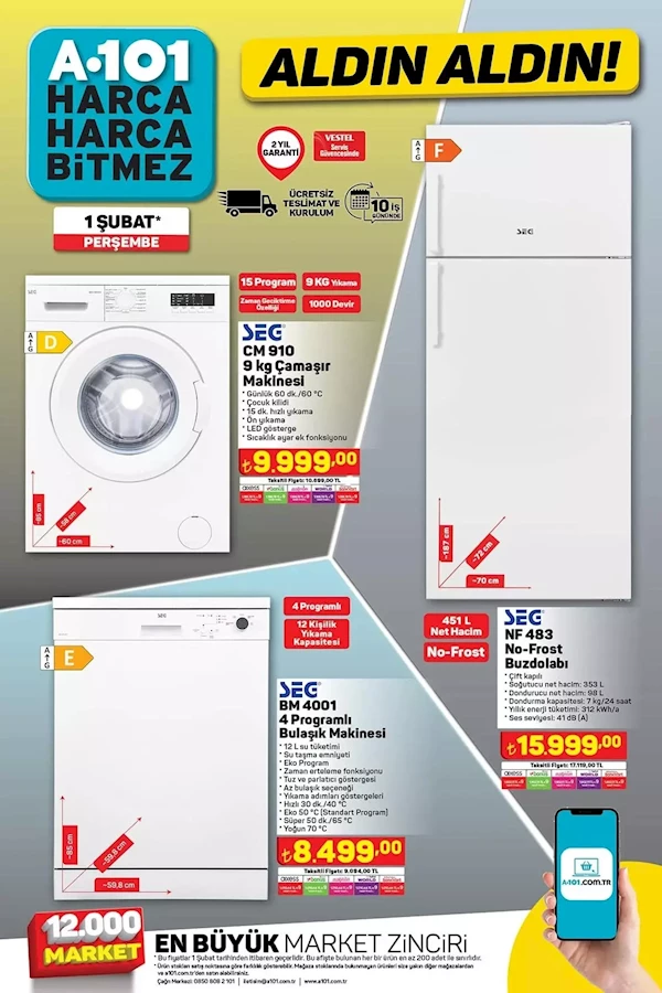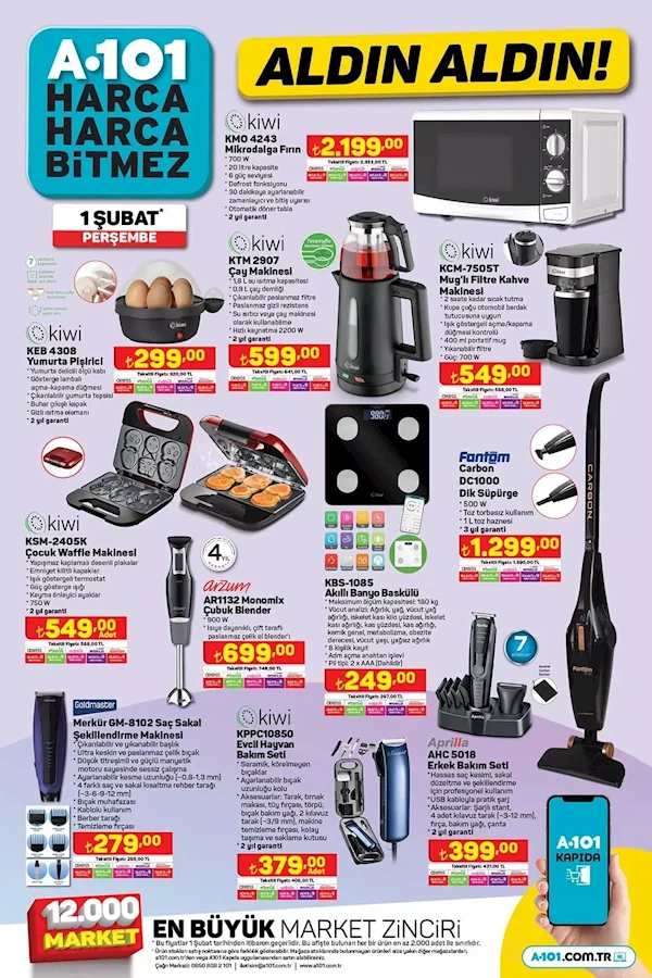 A101 haftanın ürünlerini yayınladı. 2 Şubat 2024 tarihinden itibaren tüm A101 marketlerinde Toshiba 58" Ultra HD Android Tv, Reeder S19 Max Cep Telefonu, SEG 4 Programlı Bulaşık Makinesi, Fantom Carbon Dik Süpürge, Goldmaster Merkür Saç Sakal Şekillendirme Makinesi, 14" Takım Çantası, Piranha Oto Cam Sileceği, Keçeli Ütü Masası Kılıfı, Puflu Köşe Koltuk, Katlanır Ürünler Mix, Kiwi Çay Makinesi ve çok daha fazlası satılacak.
