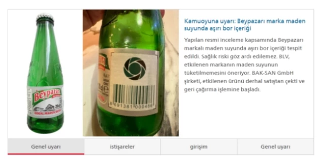 İsviçre Federal Gıda Güvenliği ve Veterinerlik Bürosu, "Kamuoyuna uyarı: Beypazarı marka maden suyunda aşırı bor içeriği" başlığıyla yayınladığı uyarıda şu ifadelere yer verdi: