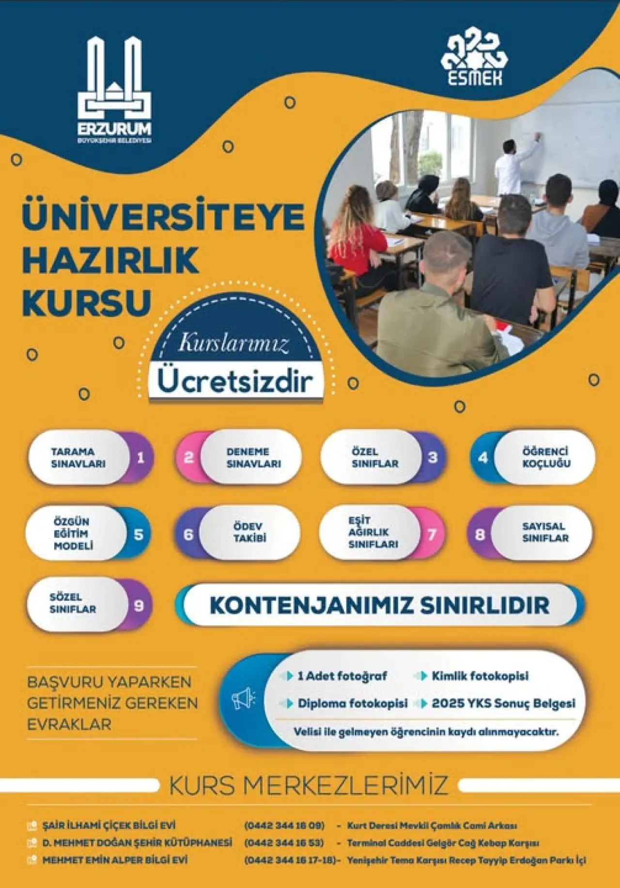 Erzurum Büyükşehir Belediyesi, gençlerin eğitimine katkı sağlamak ve üniversiteye hazırlık sürecinde öğrencileri desteklemek amacıyla Ücretsiz Üniversiteye Hazırlık Kursları düzenliyor. Belediye tarafından yapılan açıklamada, kursların öğrencilerin akademik başarılarını artırmayı ve sınavlara hazırlık süreçlerini daha verimli hâle getirmeyi hedeflediği belirtildi.
