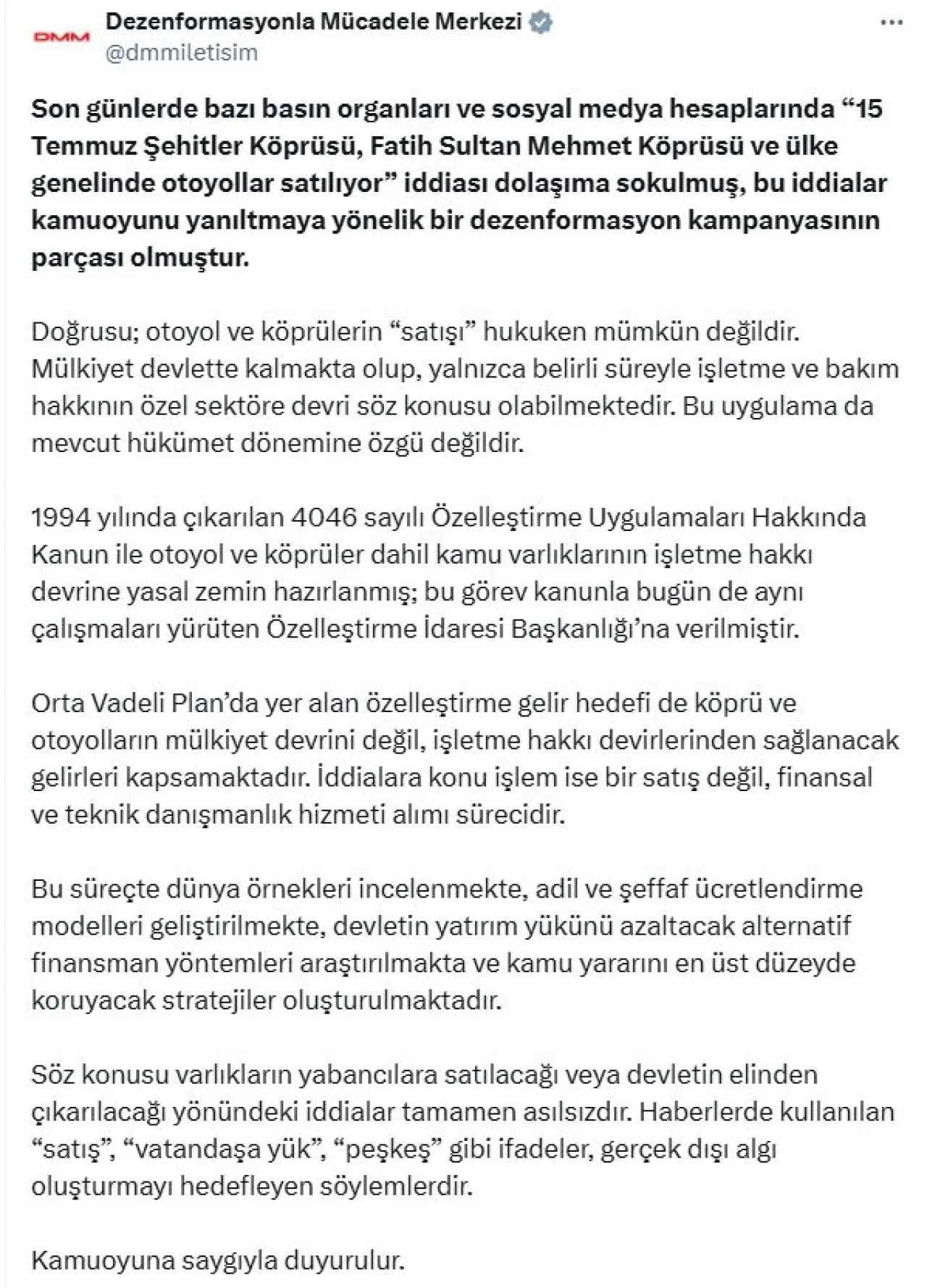 DMM'nin sosyal medya hesabından yapılan açıklamada, "Son günlerde bazı basın organları ve sosyal medya hesaplarında '15 Temmuz Şehitler Köprüsü, Fatih Sultan Mehmet Köprüsü ve ülke genelinde otoyollar satılıyor' iddiası dolaşıma sokulmuş, bu iddialar kamuoyunu yanıltmaya yönelik bir dezenformasyon kampanyasının parçası olmuştur. Doğrusu; otoyol ve köprülerin satışı hukuken mümkün değildir. Mülkiyet devlette kalmakta olup, yalnızca belirli süreyle işletme ve bakım hakkının özel sektöre devri söz konusu olabilmektedir. Bu uygulama da mevcut hükümet dönemine özgü değildir" denildi.