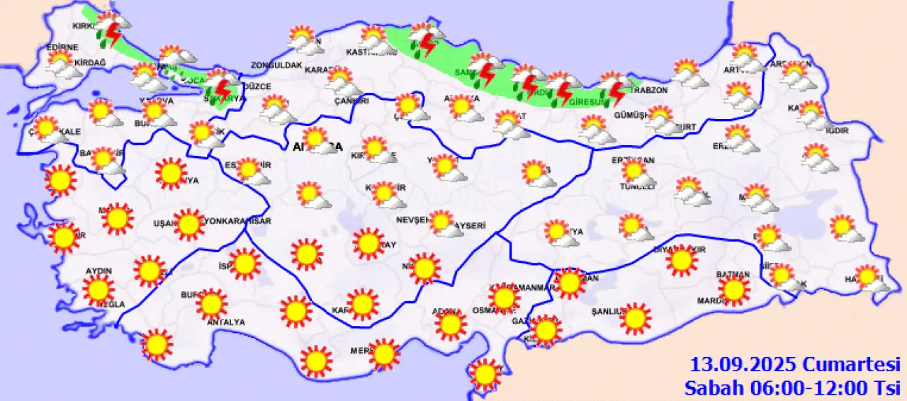 Meteoroloji Genel Müdürlüğü tarafından yapılan tahminlerde; ülkemizin kuzey ve batı kesimleri parçalı yer yer çok bulutlu, Orta ve Doğu Karadeniz kıyıları, Sinop, Sakarya, Çankırı, Ankara çevreleri ile Kocaeli, İstanbul'un kuzey ilçeleri, Eskişehir’in güney ve doğusu, Afyonkarahisar’ın doğusu, Konya’nın kuzey ve batısı ve Kastamonu ve Kırklareli kıyılarının yerel sağanak ve gök gürültülü sağanak yağışlı, diğer yerlerin az bulutlu ve açık geçeceği aktarıldı. Hava sıcaklığının, yurdun doğu kesimlerinde mevsim normalleri civarında, diğer yerlerde normallerinin üzerinde olacak.