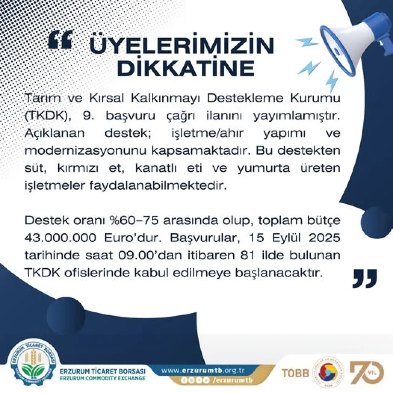 Erzurum Ticaret Borsası, sosyal medya hesapları üzerinden yaptığı paylaşımla üreticileri bu önemli destekten yararlanmaya davet etti. Yetkililer, TKDK desteklerinin sadece işletmelerin modernizasyonuna katkı sağlamakla kalmayıp, aynı zamanda bölgesel tarım ekonomisinin güçlenmesine de önemli katkı sunduğunu belirtti.