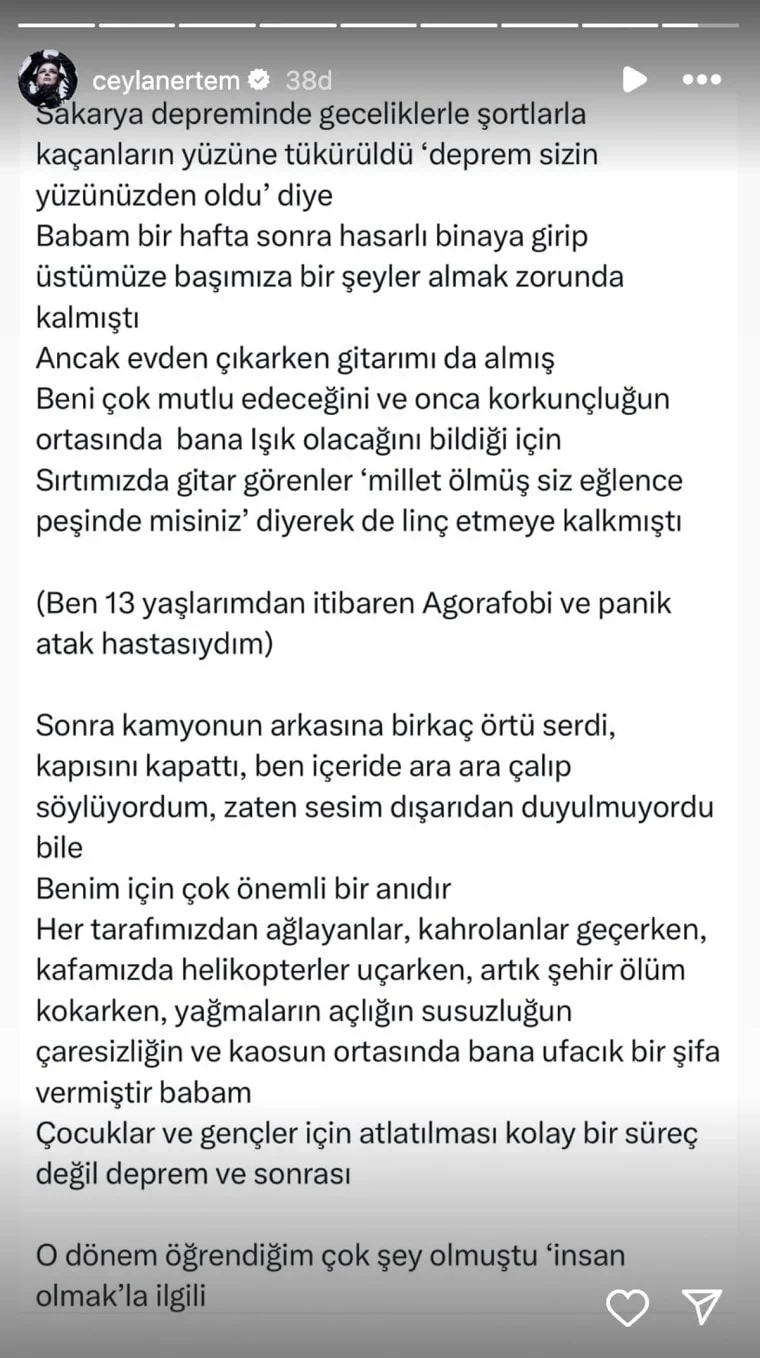 13 yaşından beri agorafobi ve panik atakla mücadele ettiğini ifade eden Ceylan Ertem, bu tür travmaların izlerini hâlâ taşıdığını dile getirdi. Sanatçı, afet anlarında kadınların maruz kaldığı psikolojik baskıların, depremin yarattığı korkuyu daha da derinleştirdiğine işaret ederek, toplumsal duyarlılık çağrısında bulundu.
