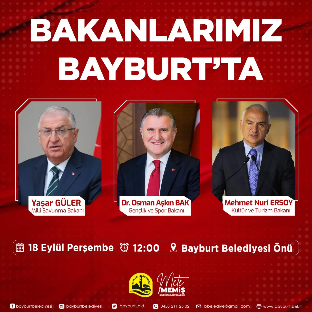Türkiye’nin önde gelen bakanları, Milli Savunma Bakanı Yaşar Güler, Gençlik ve Spor Bakanı Dr. Osman Aşkın Bak ve Kültür ve Turizm Bakanı Mehmet Nuri Ersoy, yarın Bayburt’a resmi bir ziyaret gerçekleştirecek. Ziyaret kapsamında bakanlar, şehrin farklı noktalarında açılışlar yapacak, incelemelerde bulunacak ve vatandaşlarla bir araya gelecek.