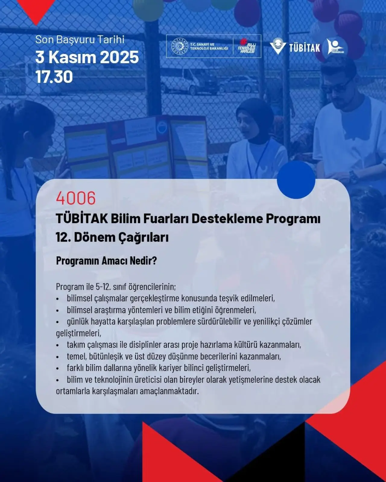 Bayburt İl Milli Eğitim Müdürlüğü, 5-12. sınıf düzeyindeki resmi okullara yönelik TÜBİTAK 4006 Bilim Fuarları Destekleme Programı’nın 12. dönem çağrılarının yayınlandığını sosyal medya hesabı üzerinden duyurdu. Yapılan açıklamada, 4006-A ve 4006-B çağrıları kapsamında öğrencilere bilimsel araştırma ve projelerini sergileme fırsatı sunan bilim fuarlarının destekleneceği bildirildi.