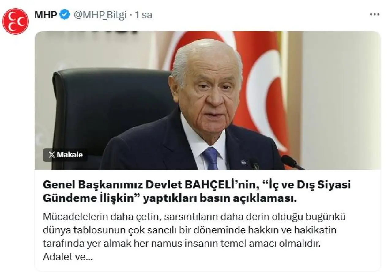 Bahçeli açıklamasının en dikkat çeken kısmında ise yeni bir uluslararası ittifak önerisini dile getirdi. Dünyaya meydan okuyan ABD-İsrail koalisyonuna karşı en uygun seçeneğin “TRÇ ittifakı” olduğunu belirten Bahçeli, bu ittifakın Türkiye, Rusya ve Çin’den oluşması gerektiğini ifade etti. “TRÇ ittifakının da; Türkiye, Rusya ve Çin’den müteşekkil olması arzu ve önerimizdir. Çaresizlik, ümitsizlik ve çözümsüzlük kuraklıktır, durgunluktur, eylem ve düşünce boyutuyla içe kapanmaktır. Türk milleti ve Türkiye Cumhuriyeti yeni yüzyılda çaresizliği reddetmiş, çözümsüzlüğü dışlamış, ümitsizliği elinin tersiyle itmiştir. Türk Devri milli birlik ve kardeşlik şuuruyla perçinlenecek, terörsüz Türkiye hedefiyle tescillenecektir. Hiçbir muhasım güç ve zihniyet bu mukadder tarih akışına engel olamayacaktır.” diyen Bahçeli, hiçbir gücün bu tarihi akışa engel olamayacağını söyledi.